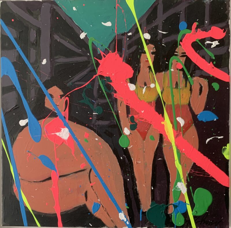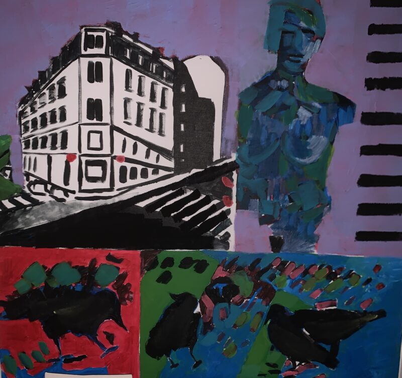 Je passe plusieurs mois d’affilés à peindre pour essayer des idées et pour utiliser les couleurs que je vois dans les endroits ou situations de tous les jours. Mes compositions sont souvent urbaines avec des couleurs variées. Je peins avec de la peinture acrylique sur toile, souvent assez rapidement, sauf quand il s’agit de coups de pinceaux qui méritent beaucoup d’attention.